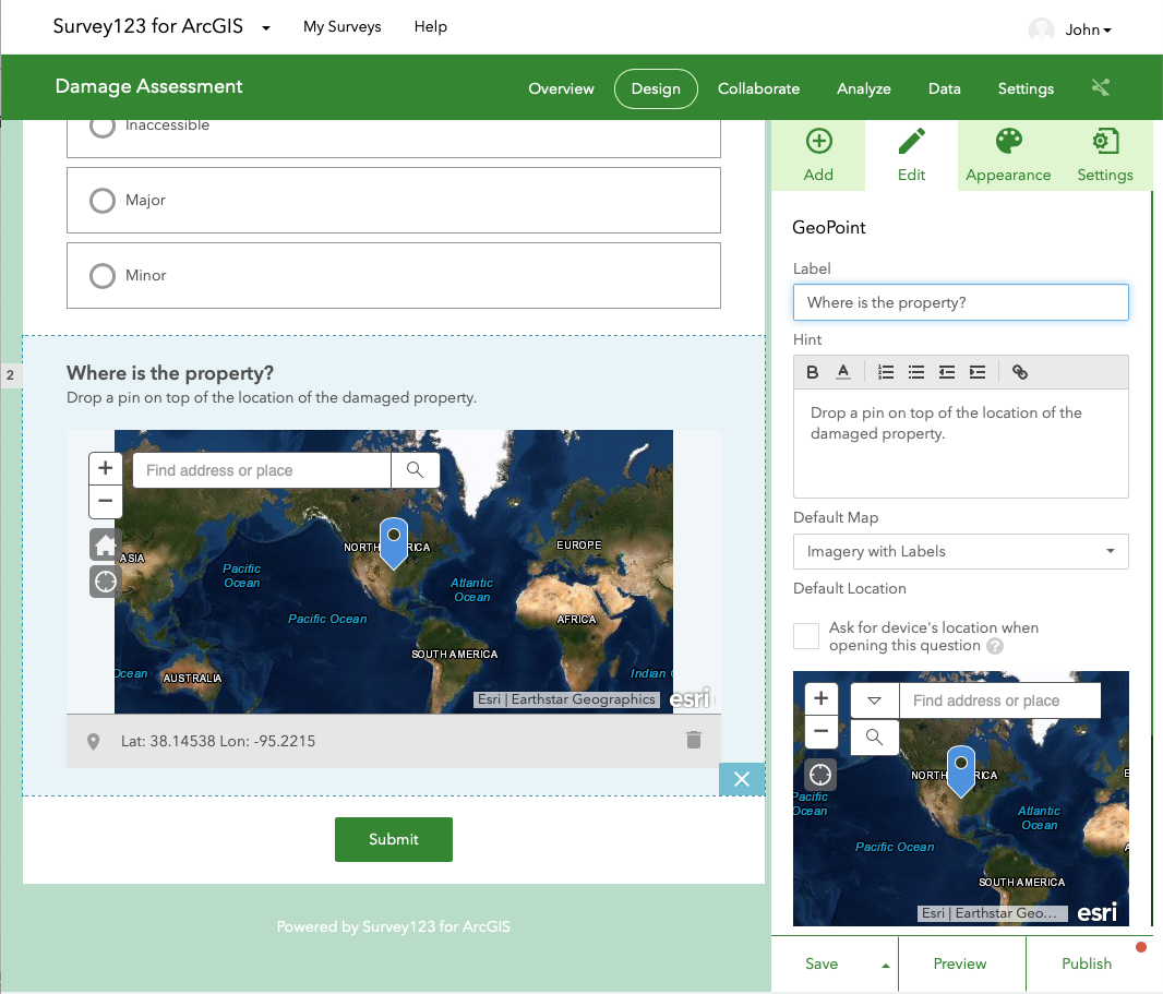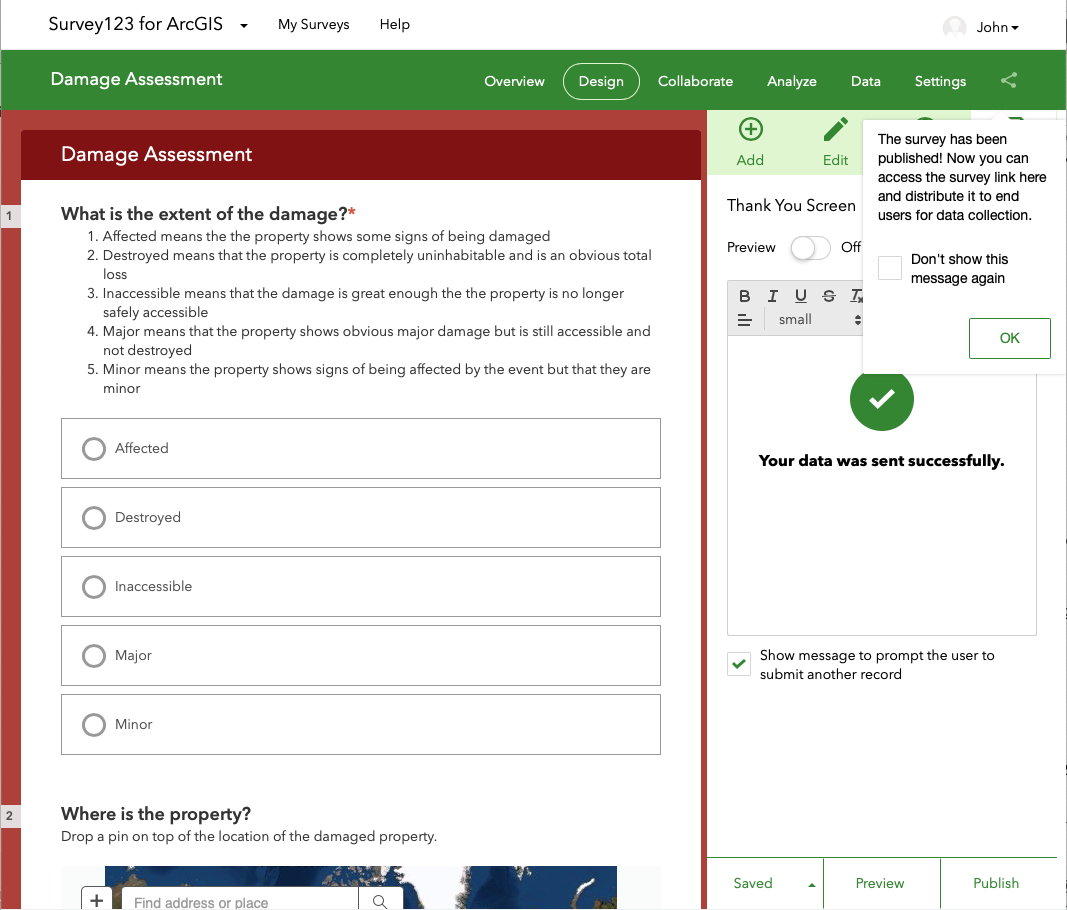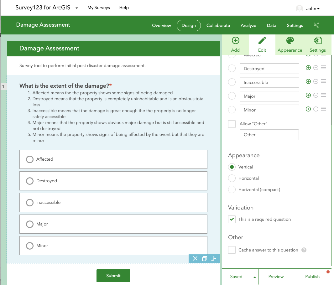 After that we added the option to add a picture and a comment to the survey. In our case, the two required options were the extent of damage and the location of the property. Once these were added we used the preview tool to see how the survey would look on the a phone, tablet or web browser, tweaked the color scheme using the "Appearance" tab, and published the survey by clicking the "Publish" button at the lower right.