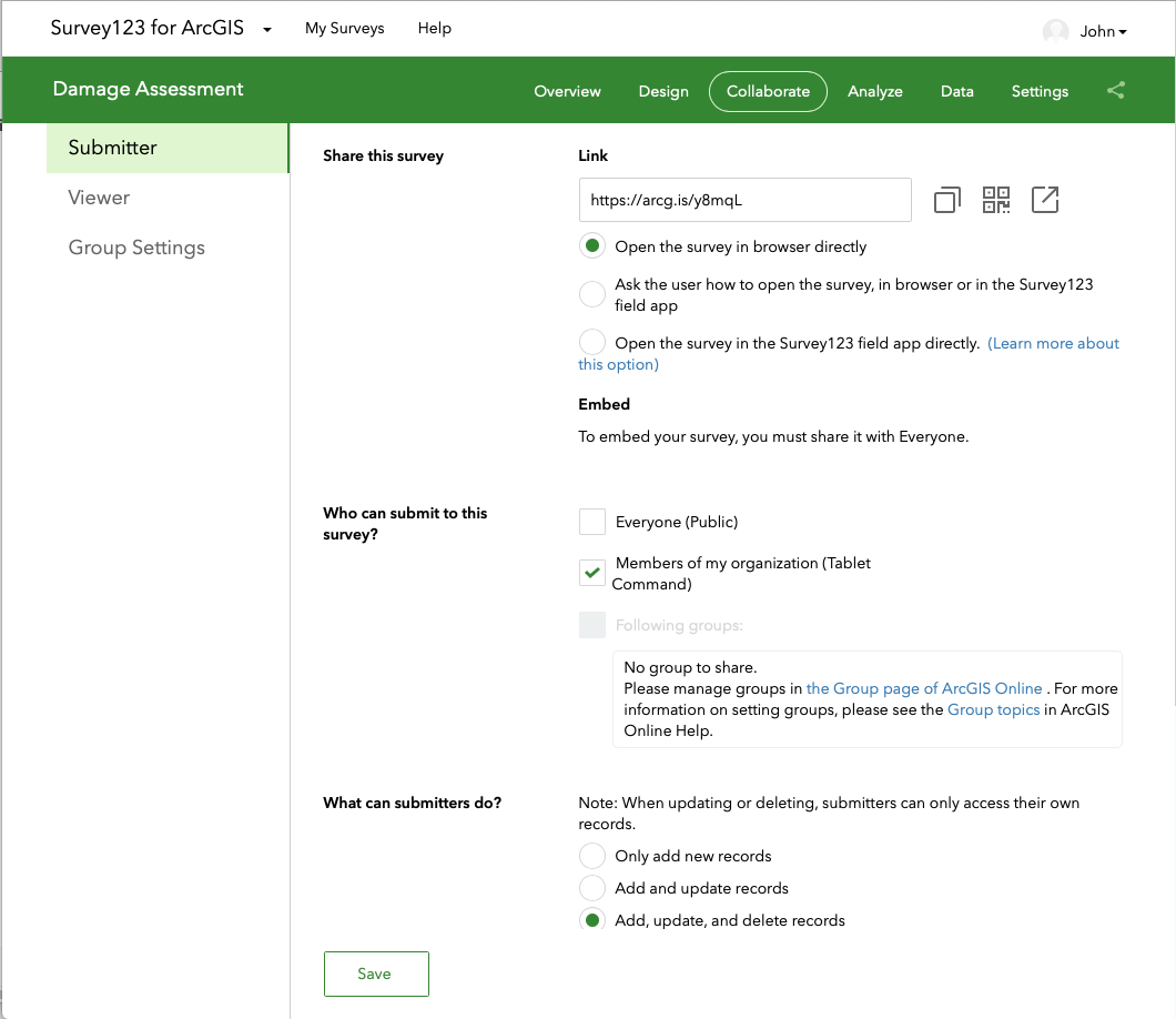 Now that your survey is published you can share it with others in your organization, share it with a group, or make it public using the tools on the Collaborate tab. In our case we made the survey only available in our organization. When you choose this option users logged into the Survey 123 app on their phone or tablet will be able to download the survey to their device, and web users will have to log into the appropriate organizational ESRI account to access the survey.