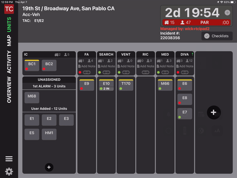 As mentioned, the Units View and the Map View interfaces have been unified. We have also added a dedicated Command Area at the upper left which essentially replaces the "IC" column in most templates, and frees up screen space for more columns. The Command Area shows three resources, and then can be scrolled if there are additional assignments.
